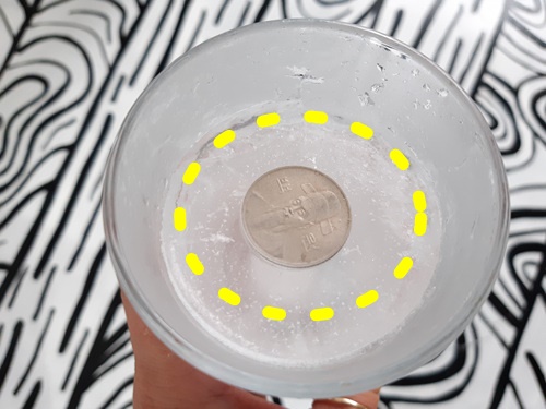 냉동실에 넣어 둔 컵에 있는 물이 얼었다면 동전을 얼음 위에 그대로 올려 주면 됩니다. 이제 이 상태로 지켜 보기만 하면 되요~ 너무 간단하죠~