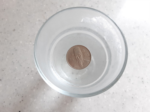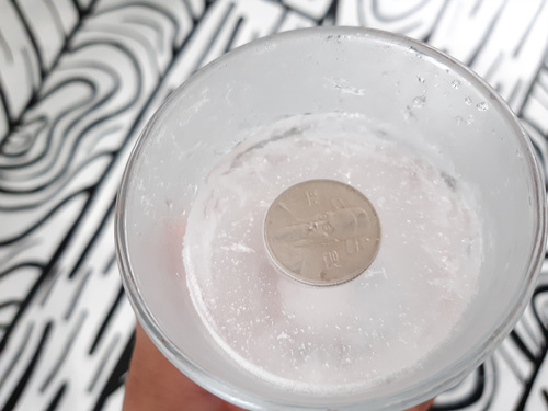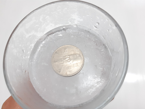 냉동실에 넣어 둔 컵에 있는 물이 얼었다면 동전을 얼음 위에 그대로 올려 주면 됩니다. 이제 이 상태로 지켜 보기만 하면 되요~ 너무 간단하죠~