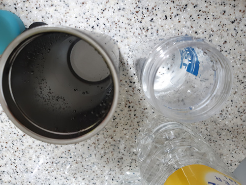일반 물병과 텀블러에 각각 반으로 물을 채웠어요. 참고로 텀블러는 물을 얼렸을때 조금 더 오래 간다는 점이긴 하지만 편한건 일반 물병이더라고요.