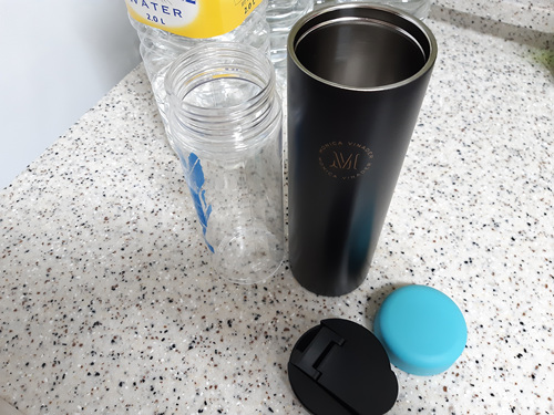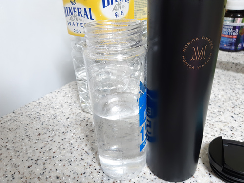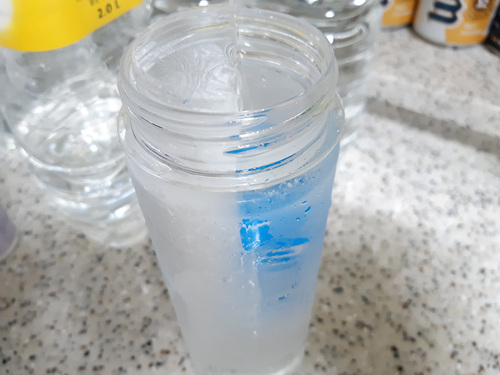 일반 물병과 텀블러에 각각 반으로 물을 채웠어요. 참고로 텀블러는 물을 얼렸을때 조금 더 오래 간다는 점이긴 하지만 편한건 일반 물병이더라고요.