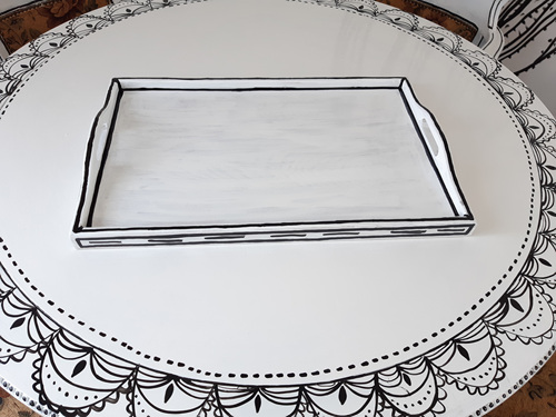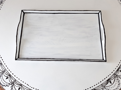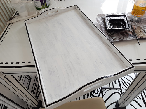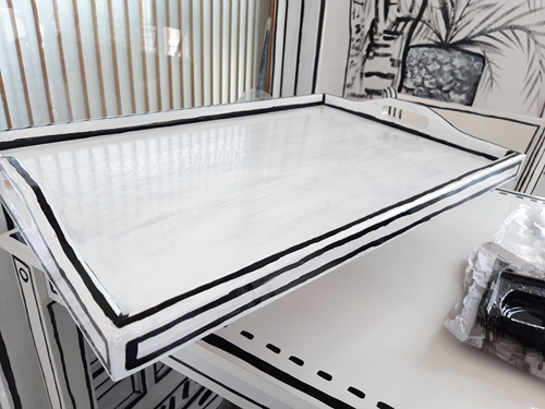 화사하게 변한 쟁반에 2D 스타일에 맞게 검정색 유성페인트로 테두리를 그려 주세요. 포인트를 잘 알고 그리면 더 이쁜 인테리어 소품으로 변한답니다.