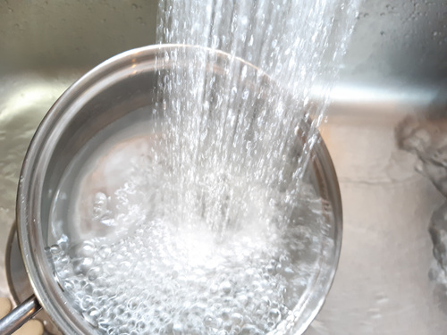 수세미로 거뭇한 부분을 지웠다면 깨끗이 냄비를 헹궈 주시면 됩니다.