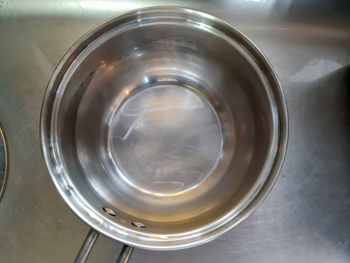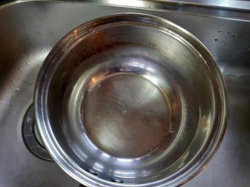 수세미로 거뭇한 부분을 지웠다면 깨끗이 냄비를 헹궈 주시면 됩니다.