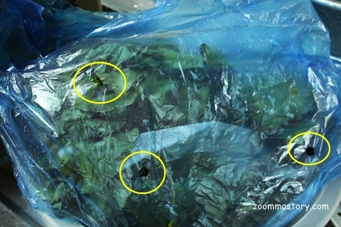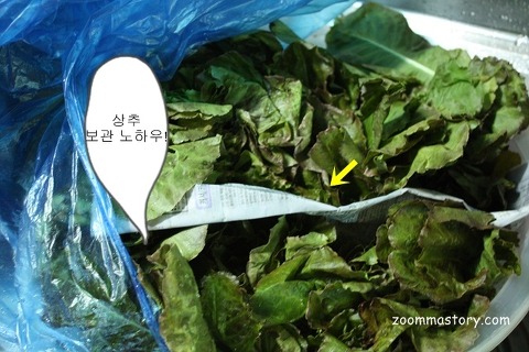 일정한 간격으로 구멍이 나 있습니다. 거기다 상추 중간에 신문지를 넣어 두었더군요...