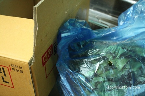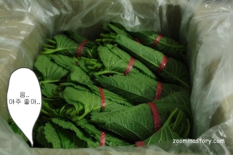 두번째..깻잎을 박스를 구입하다보니 안의 포장은 비닐로 꽁꽁 싸매어져 있더군요. 제 생각엔 깻잎은 쉽게 잘 마르기때문에 공기구멍이 있음 말라서 빨리 변색이 되어 오랫동안 보관하기 힘들어서 그런것 같습니다.