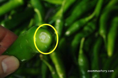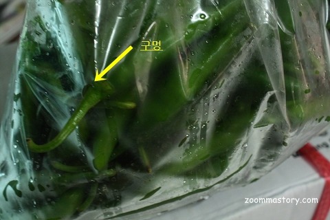 보통 채소코너는 온도가 다른 곳보다 좀 더 낮게 온도를 낮춰 판매하고 있기때문에 비닐안에 넣으면 쉽게 수분이 생기기 쉽습니다. 그렇다보니 고추는 물기가 있으면 쉽게 물러지는 경우가 있어 그것을 방지하기 위해 비닐 곳곳에 구멍이 나 있었던 것.....그래서 며칠동안 판매대에 놓아 두어도 신선도를 유지하는 비결이라는..