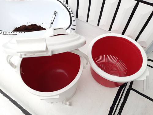 오래된 세월만큼 음식물쓰레기통 겉면은 빛바랜 색이 되었지만 통 안쪽은 여전히 붉은 색을 보여 줍니다. 물론 이 음식물쓰레기통은 제주도에선 사용하지 않지요. 그래서 소품으로 변신 시킬려구요. 버리긴 추억이 너무 느껴져서....