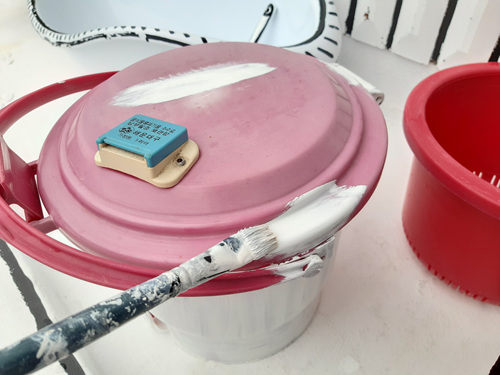 전체적으로 하얗게 칠한 음식물쓰레기통을 하루 정도 바짝 잘 말려 주었습니다. 그리고 처음 그 느낌 그대로 음식물쓰레기통에 있던 글귀도 꼼꼼히 그려 주었습니다.