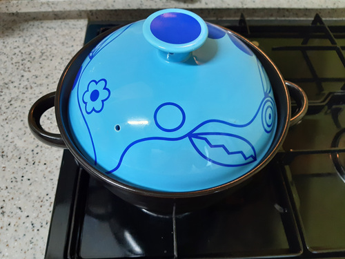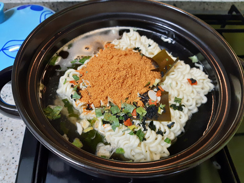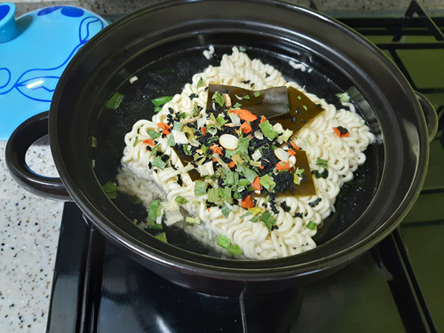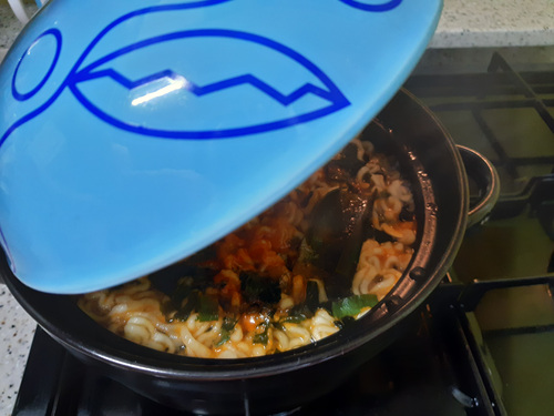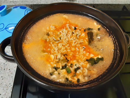 이렇게 뚝배기 뚜껑을 닫아 두는 이유는 라면 뜸을 들이는 것이지요.