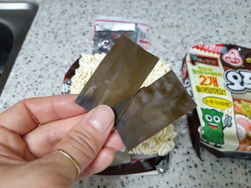 ㅎㅎ... 진짜 라면 속에 다시마 2개 들어 있습니다. 규격도 일정하고 ....