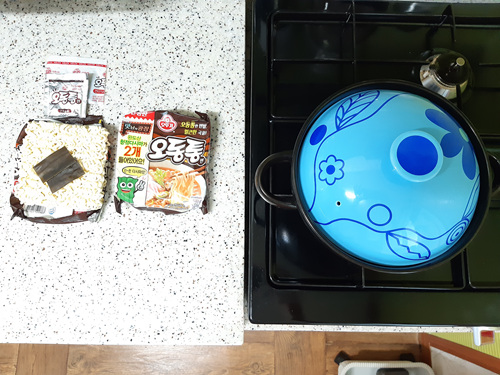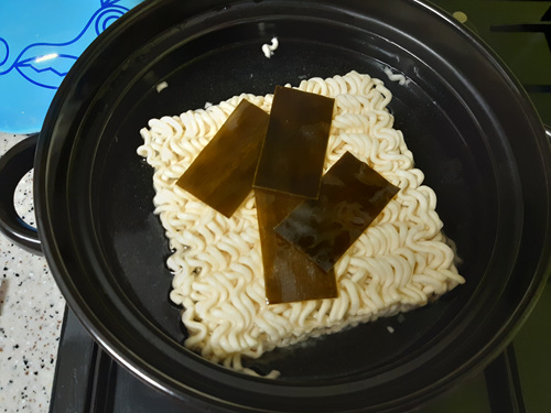 가스렌지에 물을 올려 물이 바닥에서 뽀글뽀글 끓기 시작하면 라면과 다시마를 넣습니다. 물의 양은 라면봉지에 적혀 있는 적정 양대로 넣으시면 되고요.