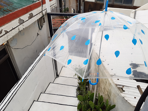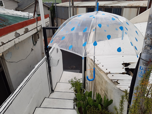 비가 오느 날 자세히 보니 역시 비를 거의 맞지 않았다. 약간의 생뚱맞은 발상이긴 하지만 나름 괜찮은 아이디어란 생각이 들었다. 물론 지금도 우산은 여전히 선인장 중앙에 잘 고정되어 있다.