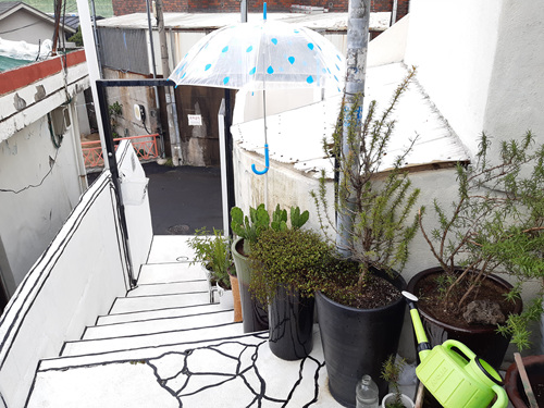 그런데 왜 우산이 하나일까? 그 이유는 우산을 써야 할 화분에 있는 녀석이 선인장이기때문이다. 물을 많이 주면 안되는 식물이기에 나름 그 생각으로 우산을 마련해 준 것이다.