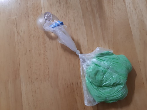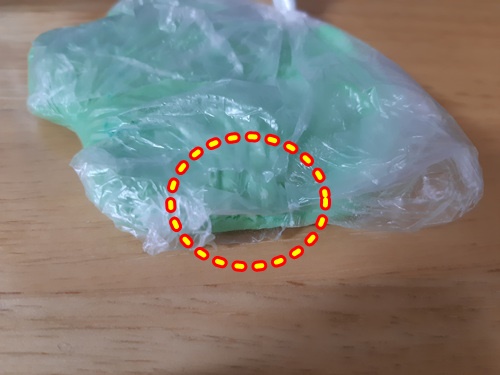 입구를 꽉 묶은 뒤 납작하게 한 번 손으로 눌러 주세요.