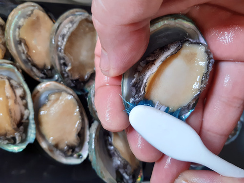 칼로 하시는 분들이 계신데 그렇게 하다 보면 손을 다칠 수 있어요. 숟가락 뒷면으로 살짝 밀듯이 밀면 쉽게 전복살이 분리됩니다.