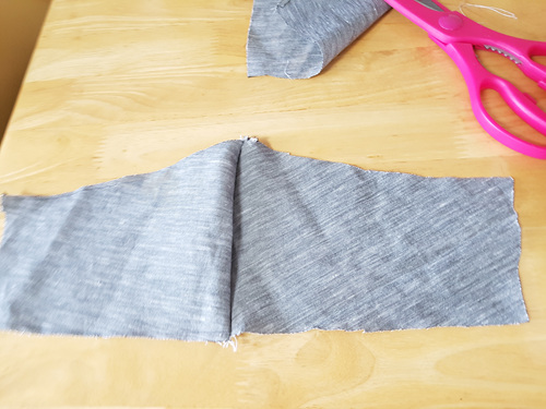 여유롭게 잘라 놓은 원단은 잘 풀리지 않게 한 번 박음질하면 튼튼한 마스크를 만들 수 있습니다.