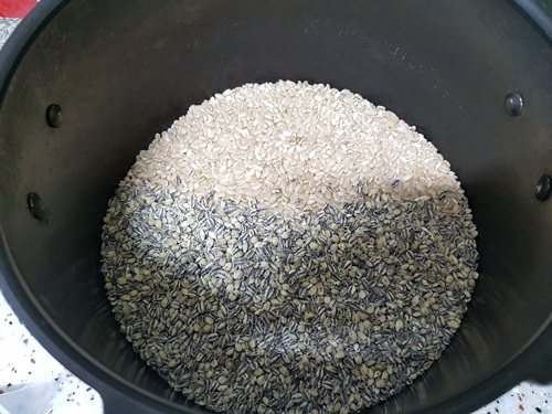 잡곡밥을 할때 비율은 알아서 하셔도 됩니다. 전 현미 반, 보리쌀 반 섞었습니다.