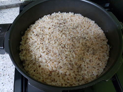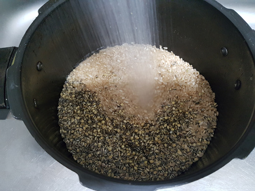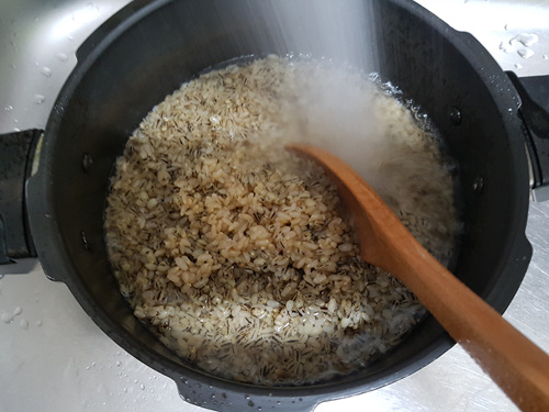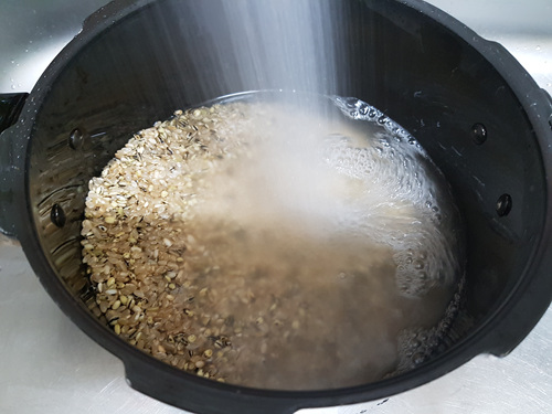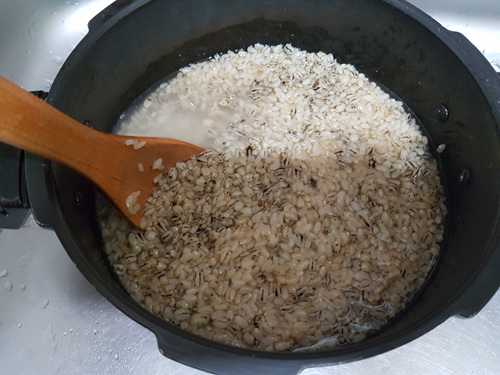 쌀을 깨끗이 씻은 뒤 물을 부어 주세요. 밥을 할때처럼 자작하게 말이죠. 이 상태로 압력밥솥에서 치카치카 소리가 나면 불을 끄고 김이 다 빠질때까지 기다립니다.