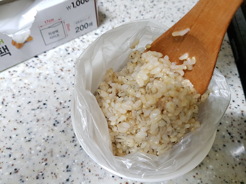한끼 분량 소분으로 할때는 밥공기를 이용하면 수월해요. 밥공기에 1회용 비닐백을 펼친 후 밥을 담으면 편해요~