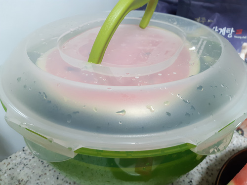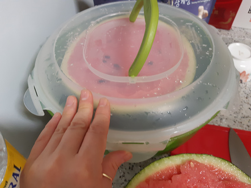 남은 수박은 이렇게 통에 보관하면 위생상 너무 좋구요. 물론 냉장고 내 음식냄새가 수박에 배이는 것을 막아주니 더 좋구요.