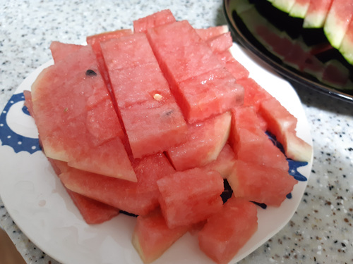 한 입에 쏙~ 들어갈 수박.. 이렇게 썰어서 먹으면 수박물이 줄줄 흐르는 일이 없이 깔끔하게 먹을 수 있겠죠.