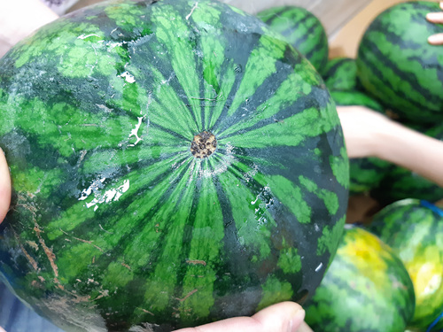 복날이다 보니 마트에는 수박사러 오신 분들이 많았습니다. 우리가 갔을때는 이미 바닥을 들어 내고 있는 수박상자였네요. 그래도 그 중에서 좋은 수박을 고르는 남편의 손길..... 수박은 꼭지부분을 확인하는 것도 좋지만 수박 바닥부분이 좁고 수박 선이 진한 것이 맛있다고 합니다. 그런 것만 잘 생각해서 골라도 90%는 실패하지 않아요.