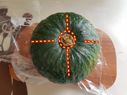 단호박을 썰때는 사진에서 처럼 네 등분을 하고 칼로 꼭지 부분을 제거하면 된다. 전자렌지에 돌려 물렁물렁한 상태이기에 칼로 써는데 힘이 많이 들어가지 않아 좋다.