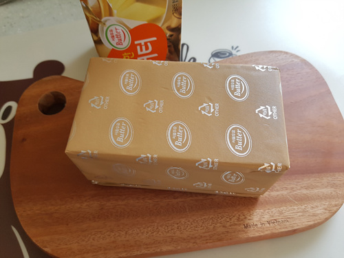 참고로 버터를 칼로 썰기 전에 조금 실온에 두면 썰기 훨씬 쉬워진다. 물론 너무 오랫동안 실온에 두면 크림화가 진행되기에 냉장고에서 꺼낸 후 약 5분 후 써는게 딱 적당했다.