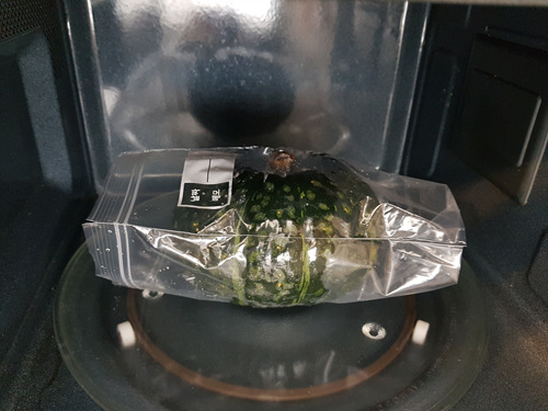 딱딱한 단호박은 물에 깨끗이 씻은 뒤 비닐백에 넣어 전자렌지에 약 5분 정도 돌리면 단호박 속도 잘 익을 뿐 더러 칼로 썰기도 좋다.