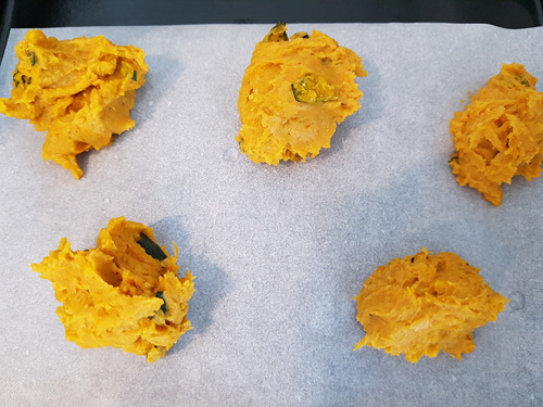 쿠키 만들 재료와 함께 단호박과 같이 섞어서 오븐에 구우면 맛있는 단호박 쿠키가 된다.