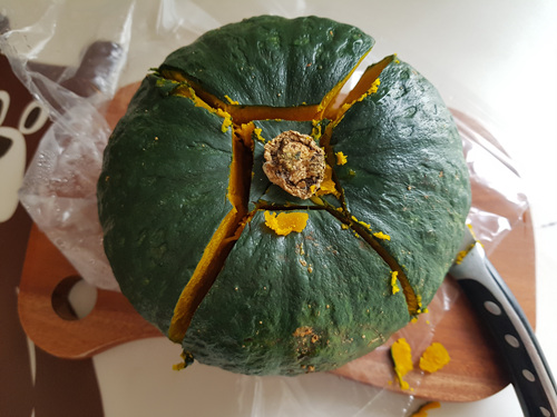 단호박 쿠키를 만들거니 딱딱한 단호박 손질도 중요하다. 그냥 칼로 썰다간 자칫 손을 다칠 위험도 있고 사실 칼도 잘 들어가지 않는다.