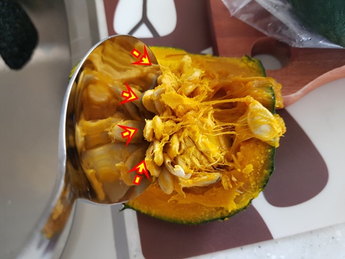단호박 씨앗은 큰 숟가락으로 긁으면 깨끗이 제거된다.