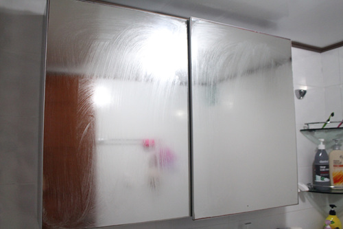 이사오긴 전부터 사용했다는 욕실거울은 언제나 뿌연 모습이었습니다. 그렇다고 그냥 이대로 두고 사용하진 않았지요. 나름대로 해 볼건 다 해 봤다는... 린스로 닦거나, 식초로 닦거나, 레몬으로 닦거나, 유리세정제로 닦아 보는 듯 여러 방법을 다 동원해 청소해도 그 순간 뿐이었죠.
