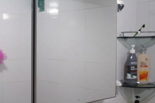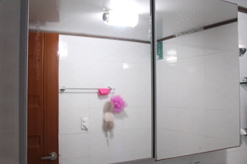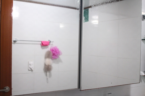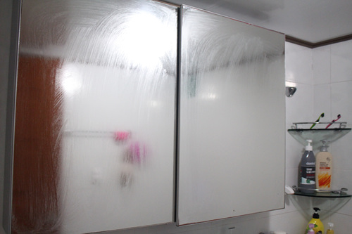 이사오긴 전부터 사용했다는 욕실거울은 언제나 뿌연 모습이었습니다. 그렇다고 그냥 이대로 두고 사용하진 않았지요. 나름대로 해 볼건 다 해 봤다는... 린스로 닦거나, 식초로 닦거나, 레몬으로 닦거나, 유리세정제로 닦아 보는 듯 여러 방법을 다 동원해 청소해도 그 순간 뿐이었죠.