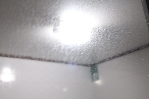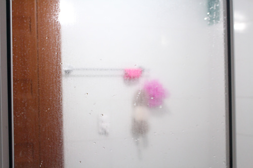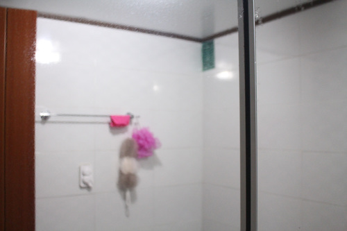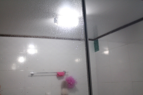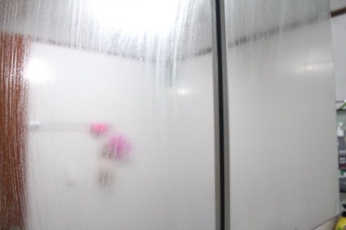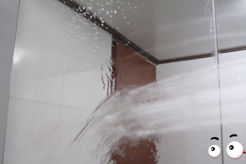 치약으로 꼼꼼히 닦아 놓은 욕실거울입니다. 5분 후 모습이구요.. 이 상태가 되면 샤워기를 이용해 헹궈 주세요.