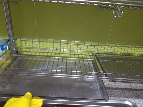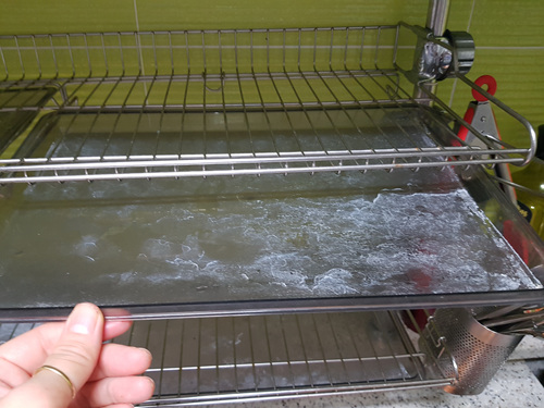 건조대 녹슨 부분을 닦았으면 이젠 물받이 씻을 차례예요. 이건 일일이 빼 준 후 주방세제를 묻혀 닦아 주세요.