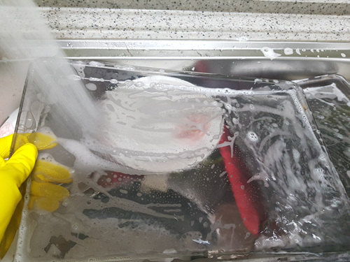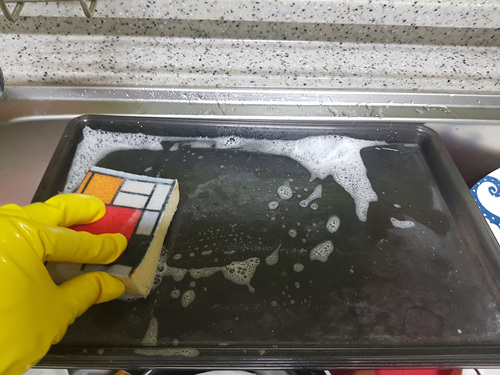 건조대 녹슨 부분을 닦았으면 이젠 물받이 씻을 차례예요. 이건 일일이 빼 준 후 주방세제를 묻혀 닦아 주세요.