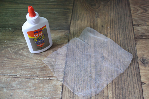마늘망을 환풍구 보다 조금 크게 자른 뒤 목공풀을 이용해 붙이기로 했습니다.