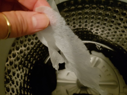 먼지가 가득 묻은 검정색 옷들을 세탁기에 넣고 물티슈 한 장을 같이 넣었어요.