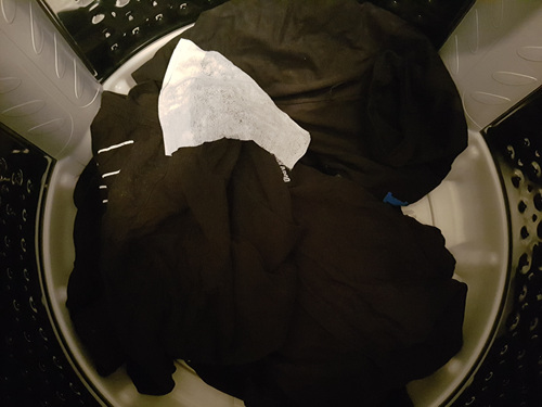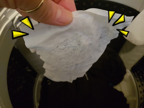 먼지가 가득 묻은 검정색 옷들을 세탁기에 넣고 물티슈 한 장을 같이 넣었어요.