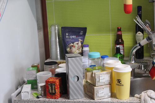 먼저 싱크대 선반에 있던 것들을 다 끄집어 내야 해요.