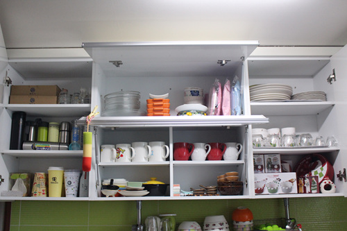 싱크대 선반을 누가 봐도 쉽게 찾고 사용할 수 있도록 해 놓아어요. 맨 윗같은 잘 안쓰는 그릇이나 물건들을 올려 두면 좋아요