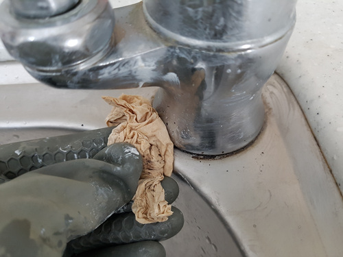 더러운 곳은 치약을 듬뿍 묻혀 닦은 후 깨끗한 티슈를 이용해 한 번 더 닦으면 정말 깨끗한 싱크대 수전이 됩니다.