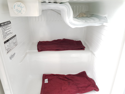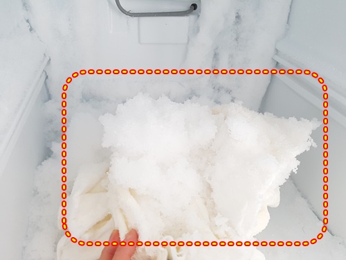 냉장실 전용은 생각보다 빨리 성에가 제거되었어요. 물이 많이 적셔진 행주는 물을 계속 짜주면서 바닥에 깔아 주세요.