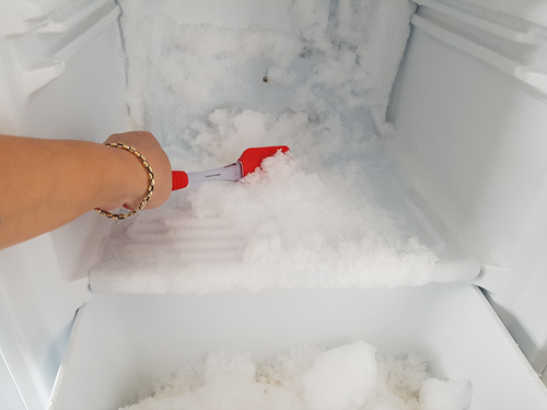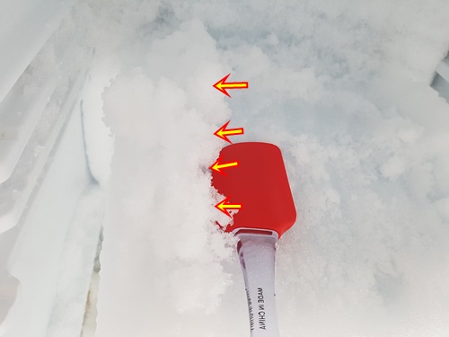 눈처럼 부드러운 성에는 주걱으로 다 긁어 주세요. 부드러우니 쉽게 제거되니 냉장고 긁힐 걱정은 하지 않아도 됩니다.
