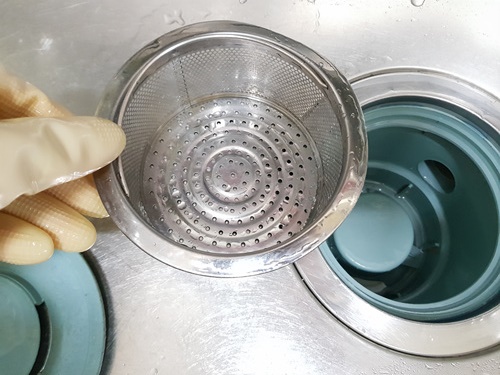 과탄산소다 한 스푼 개수대에 뿌리고 뜨거운 물을 부어 청소합니다.