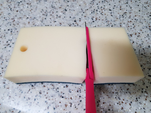 그럼 제대로 된 설거지법 한 번 보실래요..일단, 수세미가 너무 낡아 새로 교체했어요. 생각보다 수세미가 커 3등분 했어요.
