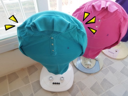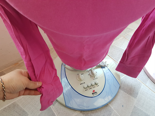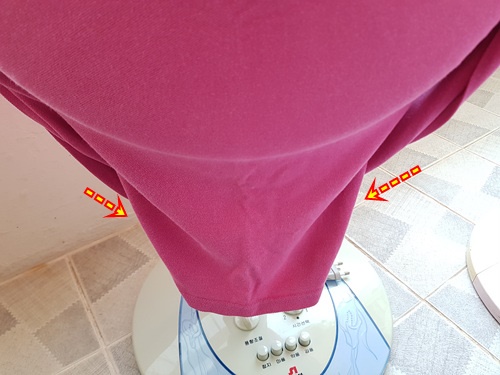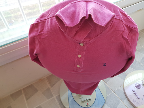 선풍기에 씌운 뒤 단추를 다 잠궈 줍니다. 그리고 옷 카라 부분을 아래로 살짝 내려 주면 선풍기 커버로 사용하기에 손색이 없지요. 어떤가요. 생각보다 간단하죠~