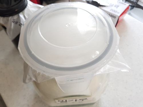 밀가루도 전 이렇게 유리병에 넣어 보관합니다. 한 번 사용 후에 자칫 그냥 보관했다가 냉장고 내 냄새가 스며든 일이 있어 꼭 이렇게 남은 밀가루는 유리병에 보관해요.