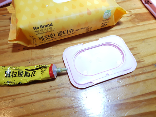 덮개만 분리하면 간단히 해결되는데요. 기존에 있던 물티슈 덮개를 떼어내 새로 사용할 물티슈에 다시 붙이면 됩니다.